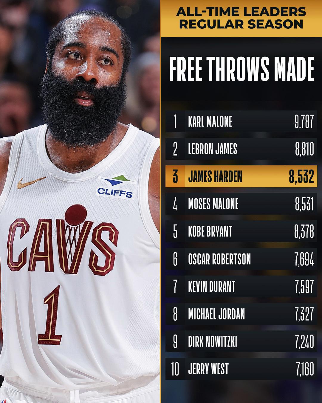 此役,哈登还创下了3大神迹。第1、此役之后,詹姆斯哈登生涯总罚球命中数来到8535个,超越名宿摩西·马龙(8531个)升至NBA历史第3,排在第2的是勒布朗詹姆斯(8810个)。